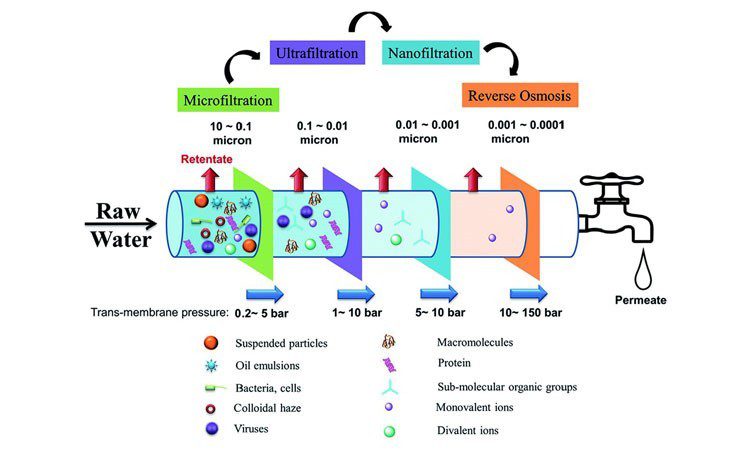نانو فیلترها در اصل فیلتراسیون با فشار پایین تر نسبت به RO است بنابراین قیمت تمام شده نانو فیلترها و انرژی مصرفی آنها كم است. سيستمهاي N.F عمدتاً براي تصفيه آب آشاميدني و يا پيش تصفيه قبل از اسمز معکوس به منظور حذف ويروس، رنگ، مواد آلي و نمکهاي دو ظرفيتي به بالا بکار برده ميشود. سيستمهاي N.F به دليل قطر كمتر منافذش، قابليت حذف سختي آب و نمكهاي چند ظرفيتي را دارند.